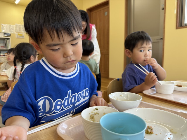完全給食(主食+副食+おやつ2回)実施しています。高美台保育園の給食室で作られた食事を、毎日当日配送しています。